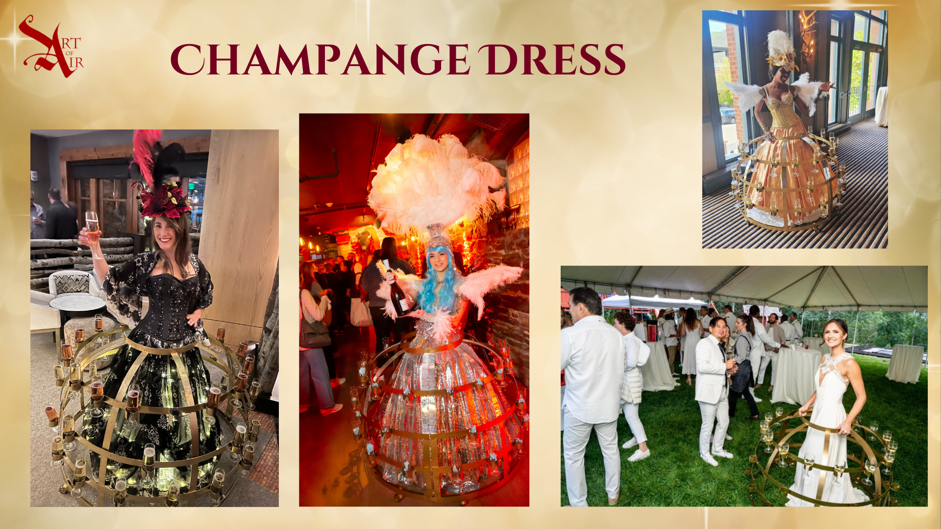 Champagne Dress: Our exquisite champagne dress is a unique and memorable way to welcome guests and add a touch of luxury to any celebration. Our professional performers elegantly display and serve champagne, creating a dazzling and interactive experience for your guests.